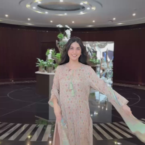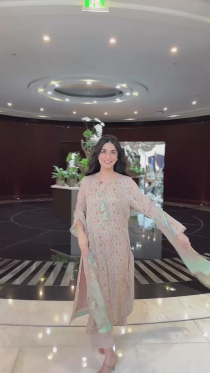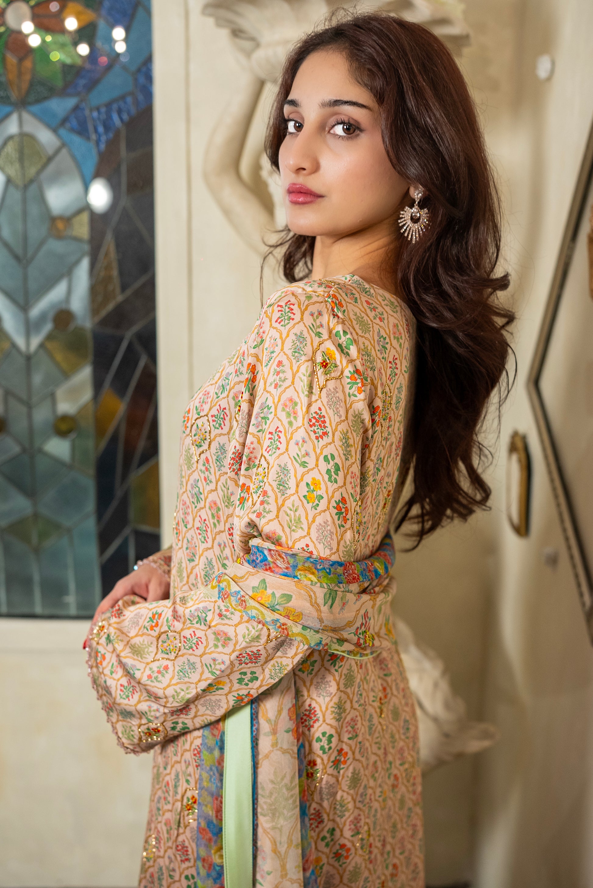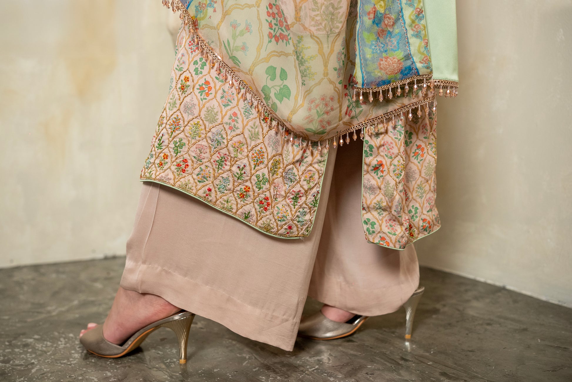 Botanica unfolds with the quiet grace of a secret garden, where silk becomes a canvas for intricate motifs outlined in fine embroidery and touched with crystal accents that glimmer like dew at dawn. The fabric carries a tactile richness, where every brush of light awakens a soft radiance, and every movement reveals a gentle shimmer of elegance. Paired with raw silk trousers for understated balance and a chiffon dupatta that drapes like a breeze through blooming branches, this ensemble captures the serenity of nature’s poetry, refined into timeless luxury.