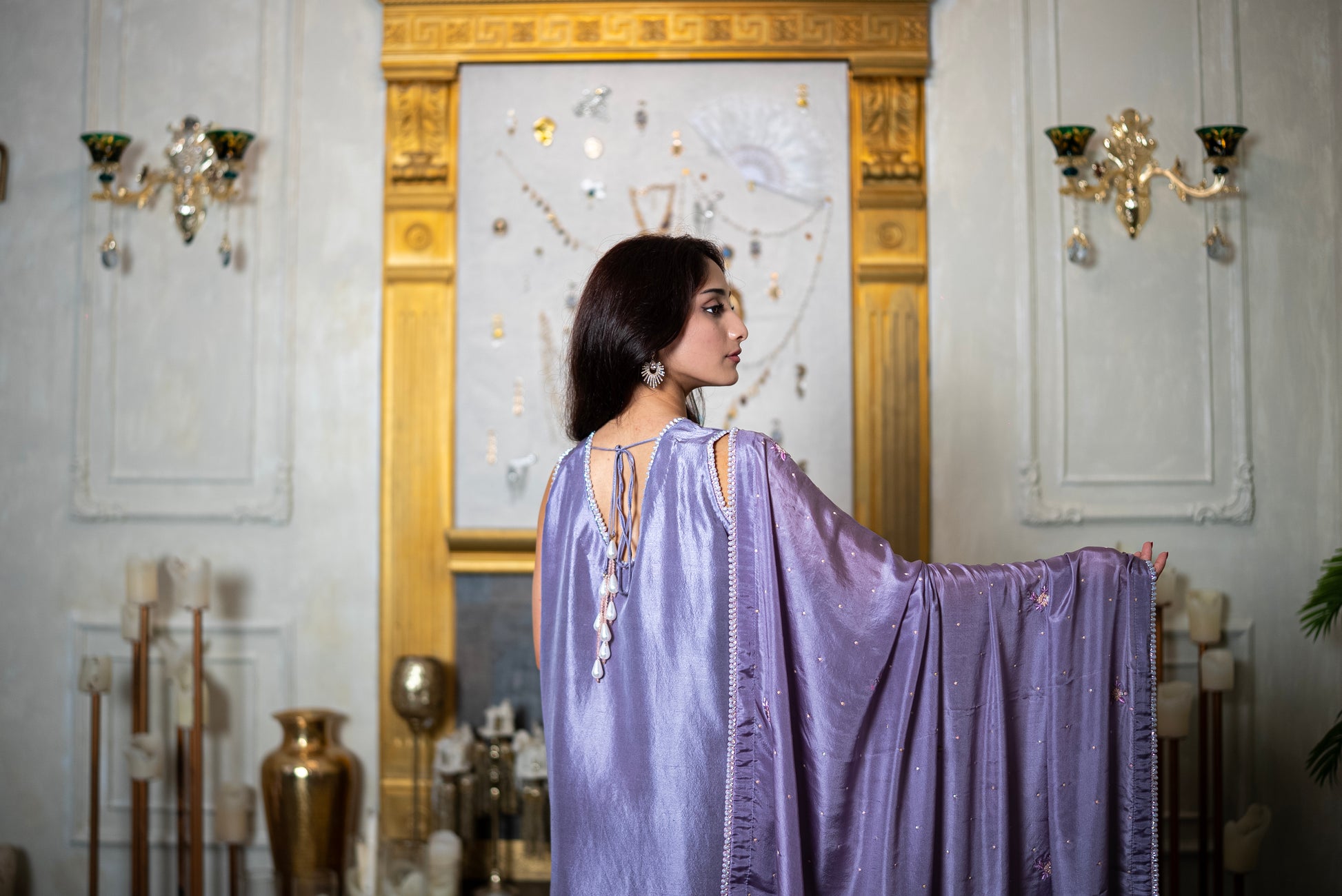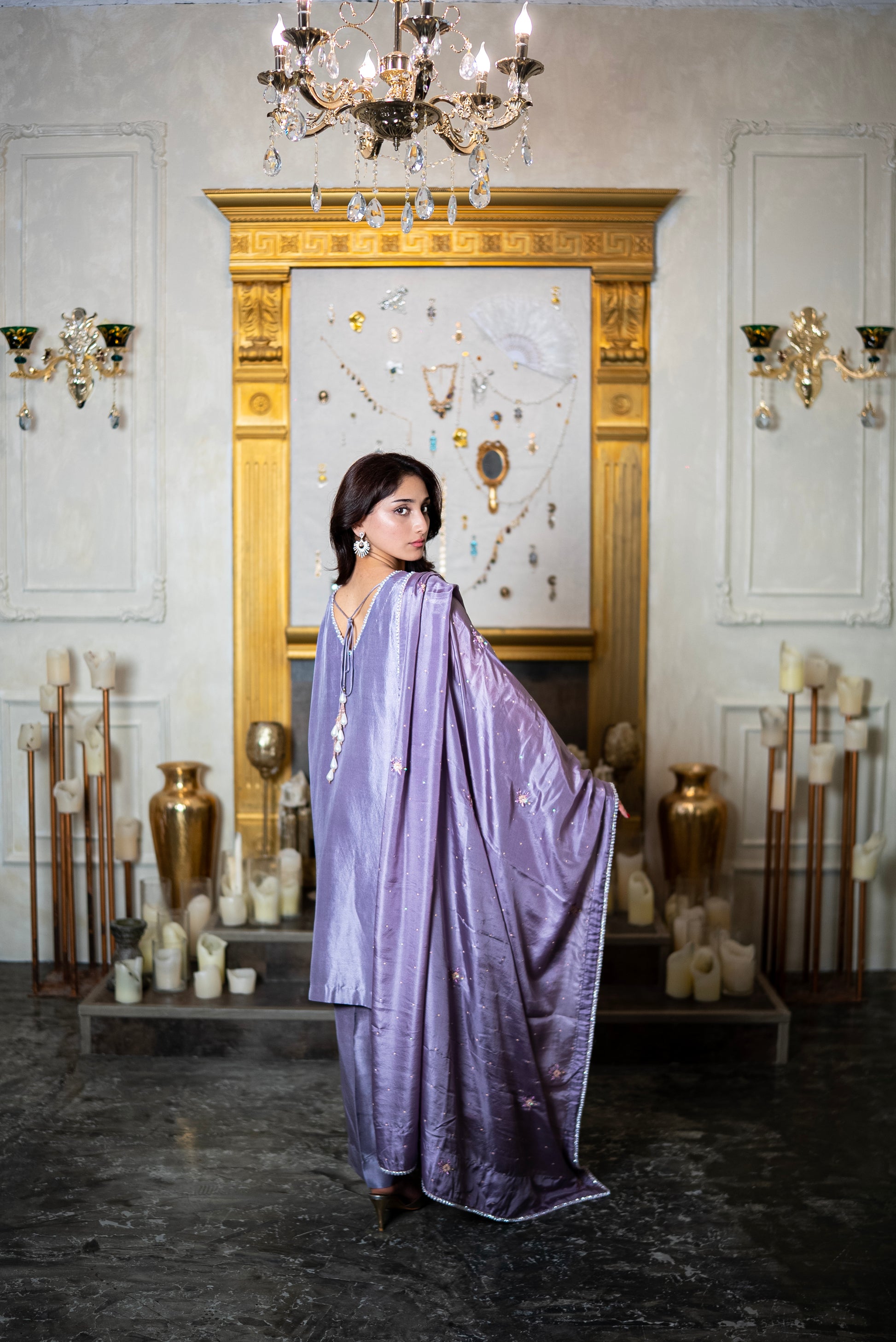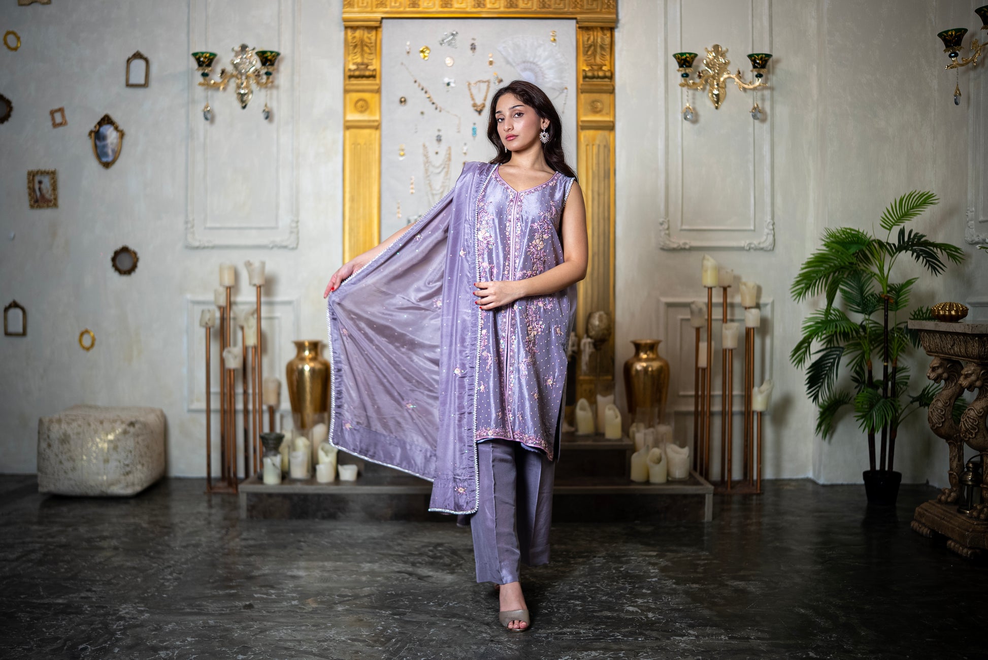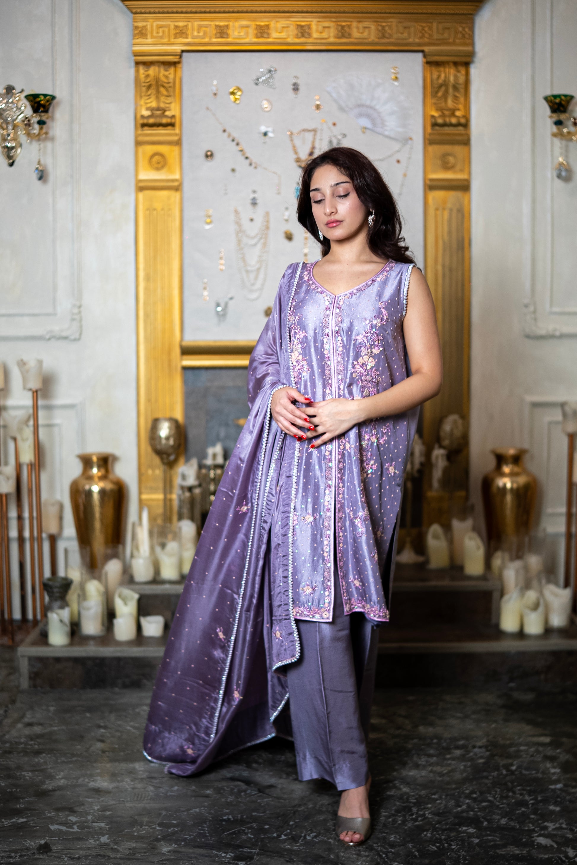Berry Sorbet features scattered stonework across the body, anchored by vertical embroidered panels through the center. These panels are richly detailed with sequins, beads, and tonal threadwork in shades of champagne, blush, and mauve, creating a continuous floral design that draws the eye. The neckline is finished with beaded edging, while pearly tassels at the back add a graceful accent. The dupatta carries the same scattered stones and fine detailing, completing the set with balance. Paired with plain raw silk trousers, this ensemble highlights intricate craftsmanship while keeping the silhouette refined.